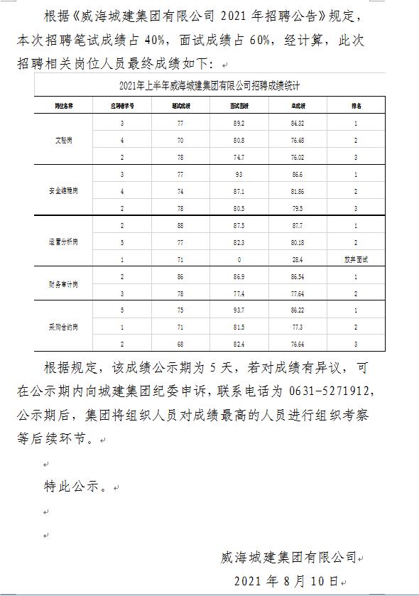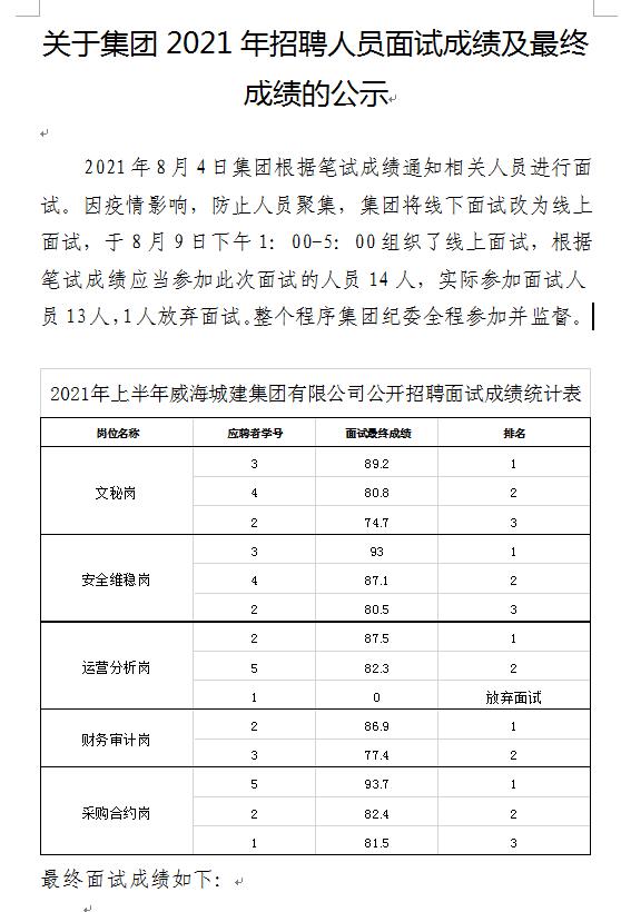 威海城建集團(tuán)2021年招聘人員面試成績及最終成績的公示